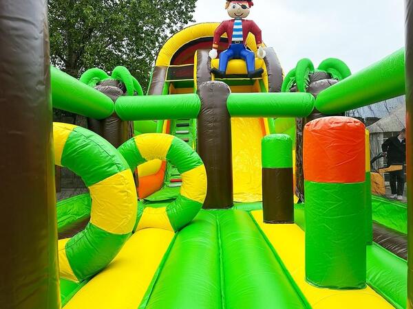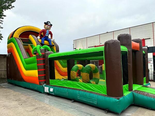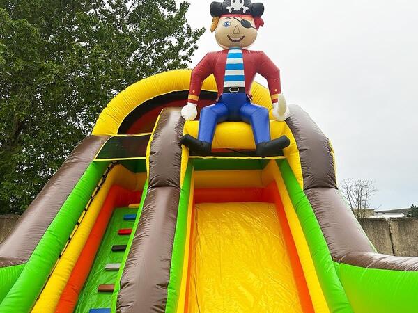 Unsere Piratenrutsche ist ein echter Spaß für alle Kinder, die Rutsche will erklimmt werden-und ab geht die Post, zusätzlice Spielelemente im Hüpfurgenteil laden zum Toben ein.