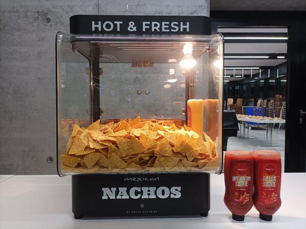 Stylisher Nacho-Wärmer – einzigartiges Design mit vorstehendem Glasbehälter, passend zum Soßenspender.